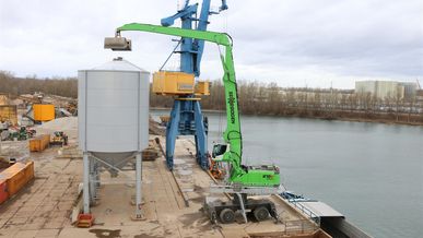 870 Mobile - Multifuncional no porto: graças ao engate rápido, os operadores portuários podem alternar com flexibilidade entre diferentes aplicações, como espalhador de big bag e caçamba clamshell.