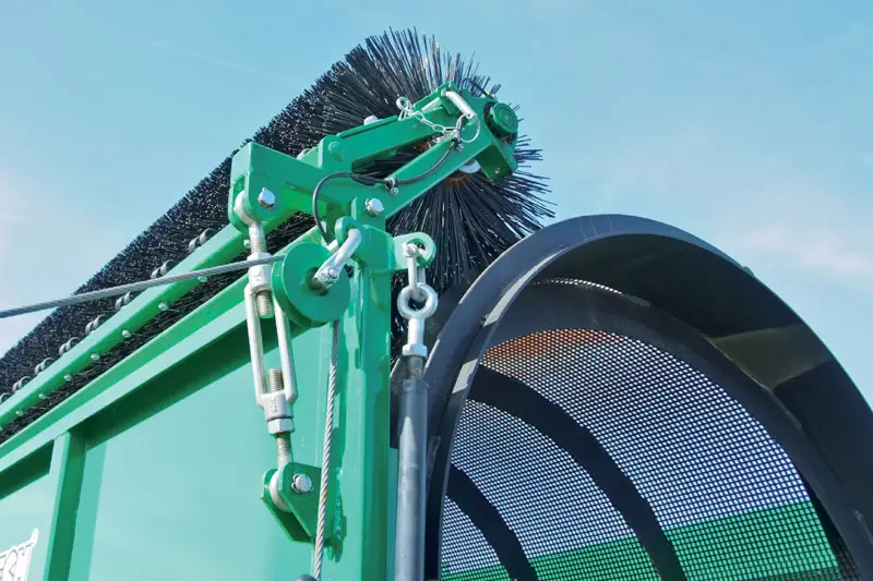 Uma escova circular de rotação livre, configurável por baixo, é usada para limpar o tambor da tela. A posição oposta ao lado da tela não apresenta risco de contaminação pelo material da tela.