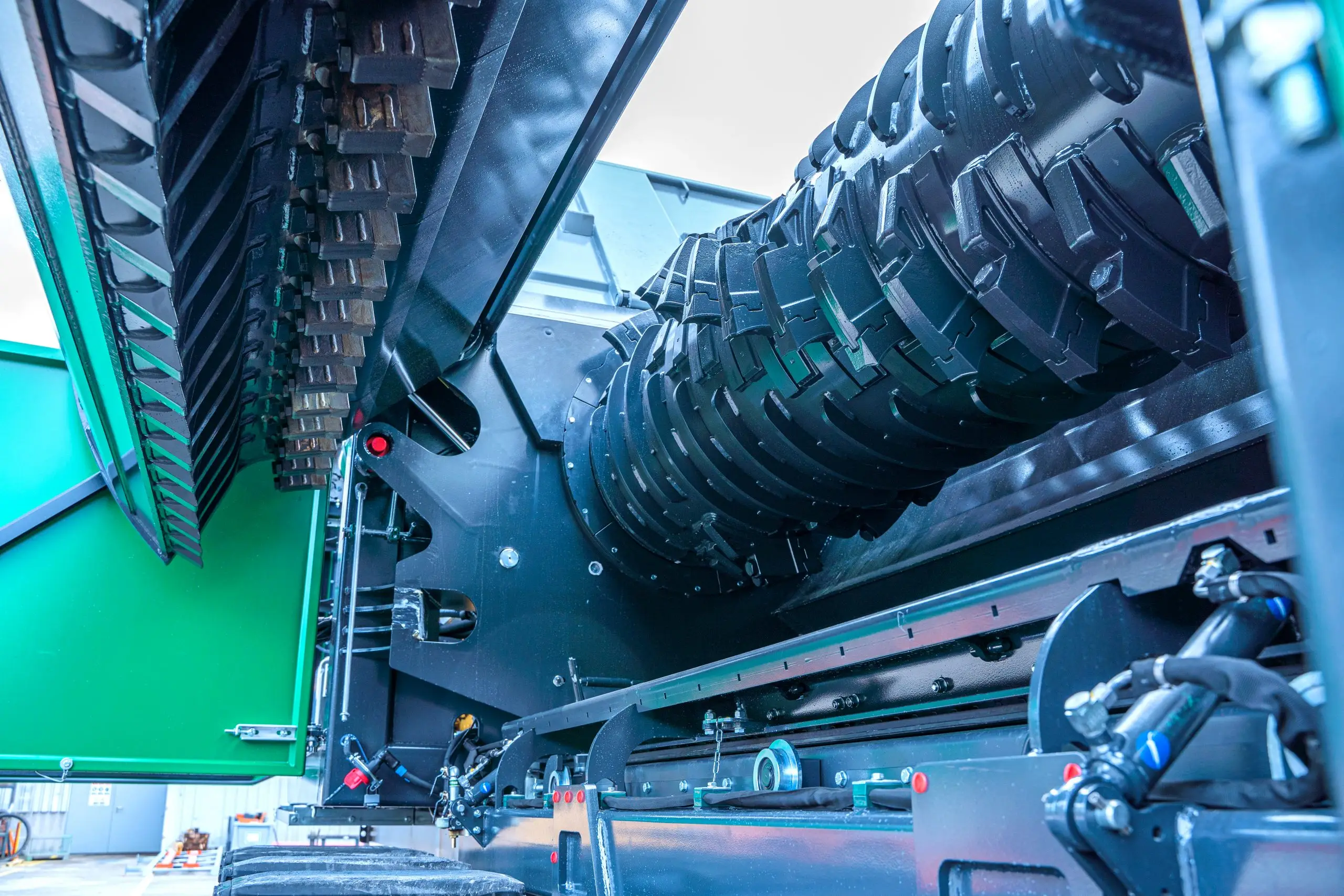 O ajuste contínuo da folga de corte permite adaptar o tamanho da partícula produzida ao uso subsequente. A rotação completa do contra-pente proporciona uma acessibilidade perfeita para a manutenção da área de trituração.