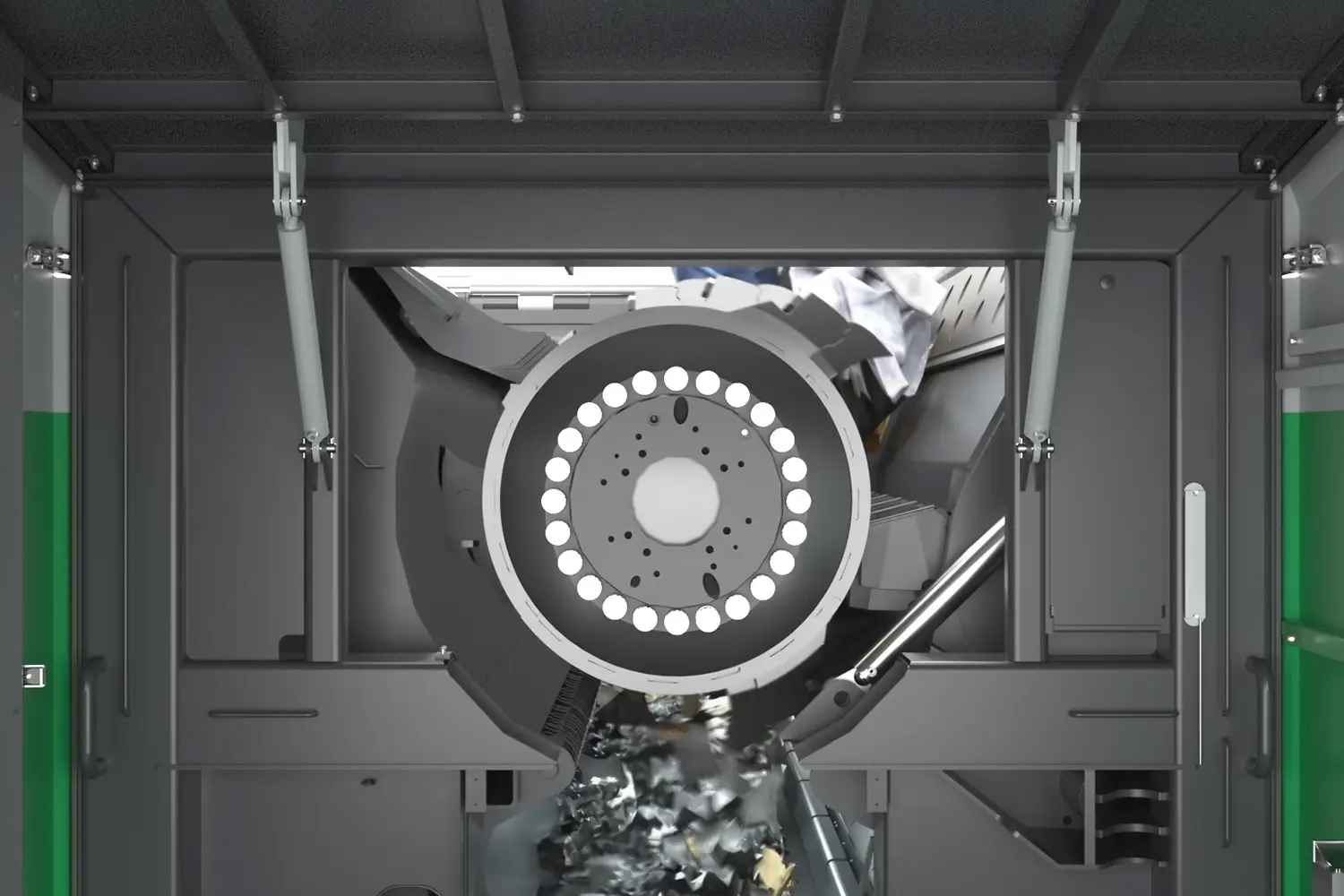 O ajuste contínuo da folga de corte permite adaptar o tamanho da partícula produzida ao uso subsequente. A rotação completa do contra-pente proporciona uma acessibilidade perfeita para a manutenção da área de trituração.